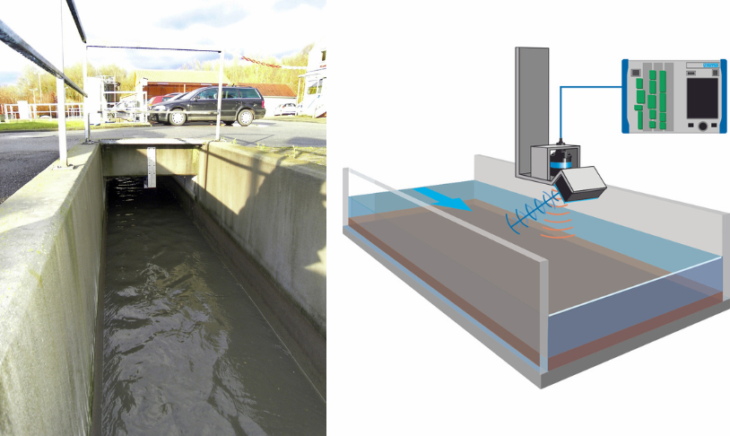 - Systemet måler overfladebølgernes hastighed og beregner den aktuelle strømningshastighed ud fra denne hastighed, det målte niveau og den definerede rektangulære kanalform.